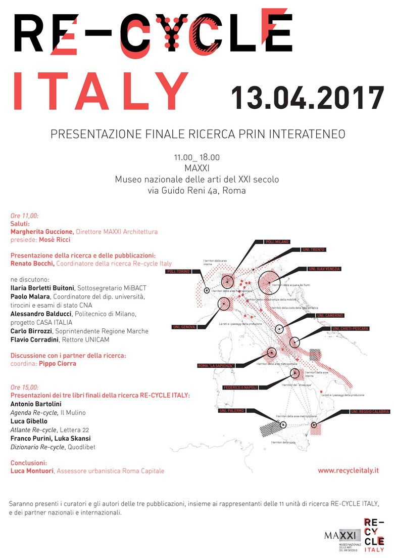 A conclusione di tre anni di lavoro, decine di pubblicazioni e tre volumi conclusivi, gli undici gruppi di ricerca del PRIN Recycle Italy (www.recycleitaly.it) distribuiti in altrettante scuole di architettura italiane che si sono assegnati il compito di approfondire ed estendere il tema lanciato nel 2011 dalla mostra Recycle presentano i risultati ottenuti in presenza di istituzioni e ospiti importanti e fortemente interessati al tema del riciclo architettonico eurbano.