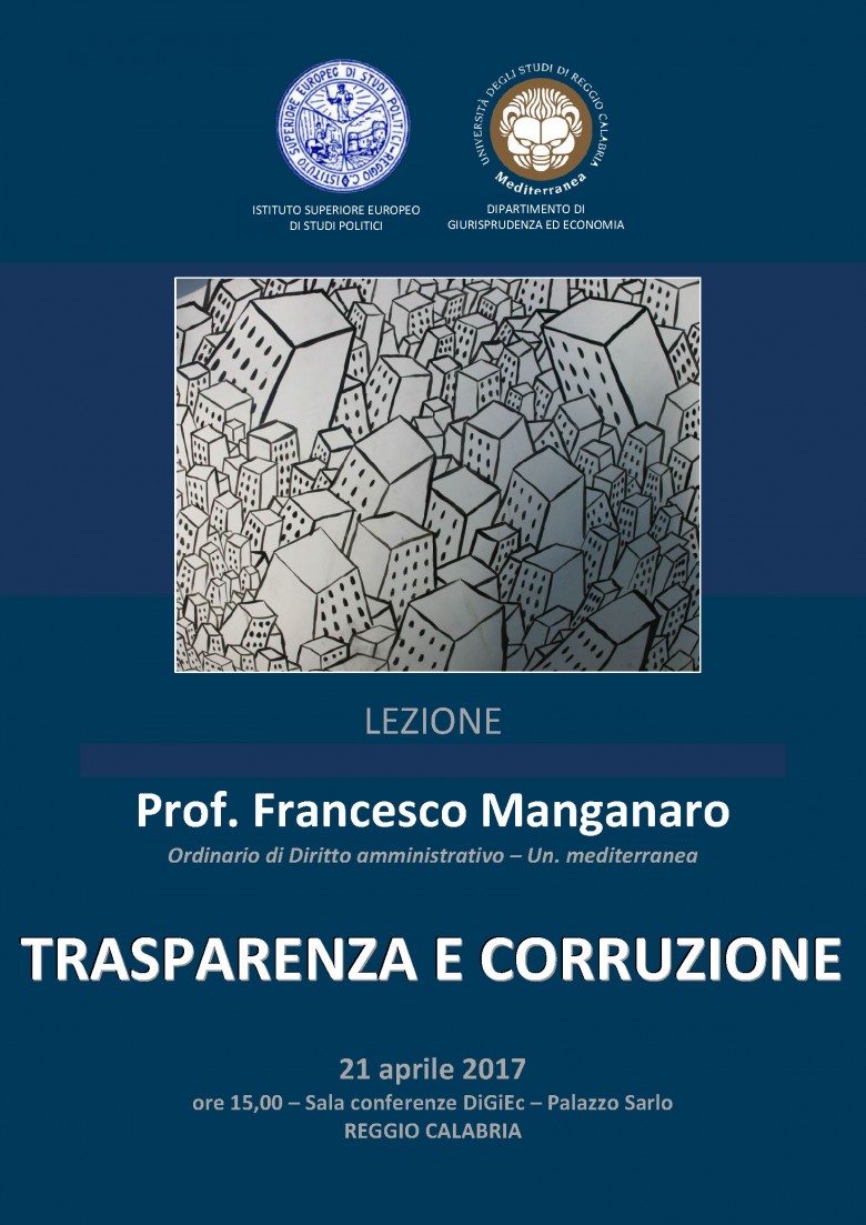 Il Terzo modulo del Corso 2016-2017 della Scuola di cultura politica prosegue con la lezione del prof. Francesco Manganaro (ordinario di Diritto amministrativo nell'Università Mediterranea) dal titolo 'Trasparenza e corruzione' che si terrà venerdì 21 aprile 2017 alle ore 15,00 presso la sala conferenze del DiGiEc a Palazzo Sarlo.