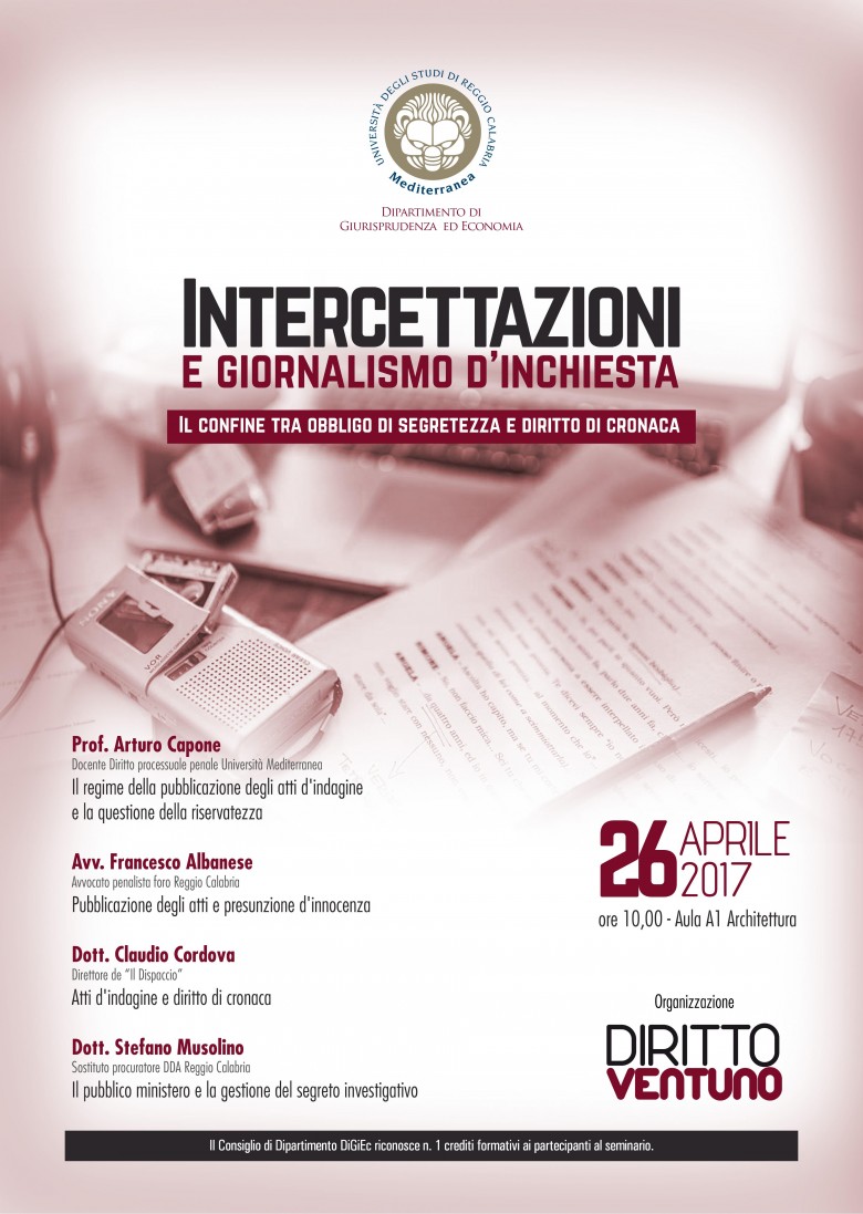 La redazione della rivista giuridica universitaria "Diritto21", periodico d'informazione a distribuzione interna del Dipartimento di Giurisprudenza ed Economia dell'ateneo reggino, organizza un incontro formativo dal titolo: "Intercettazioni e giornalismo d'inchiesta: il confine tra obbligo di segretezza e diritto di cronaca".