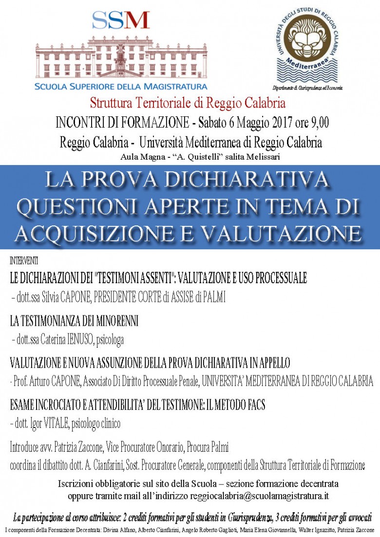 La Scuola Superiore della Magistratura, sezione territoriale di Reggio Calabria, organizza, in collaborazione con il Dipartimento di Giurisprudenza ed Economia, un incontro sul tema dell'acquisizione e valutazione della prova dichiarativa.