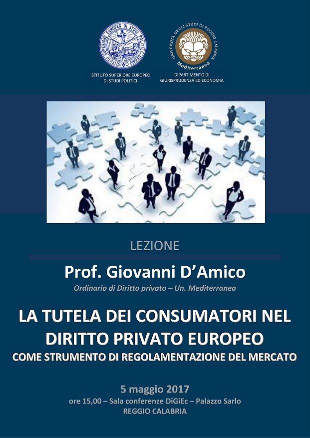 Il Terzo modulo del Corso 2016-2017 della 'Scuola di cultura politica' prosegue con la lezione del prof. Giovanni D'Amico (ordinario di diritto privato nell'Università Mediterranea) dal titolo 'La tutela dei consumatori nel diritto privato europeo come strumento di regolamentazione dei mercati' che si terrà venerdì 5 maggio 2017 alle ore 15,00 presso la sala conferenze del DiGiEc - Palazzo Sarlo.