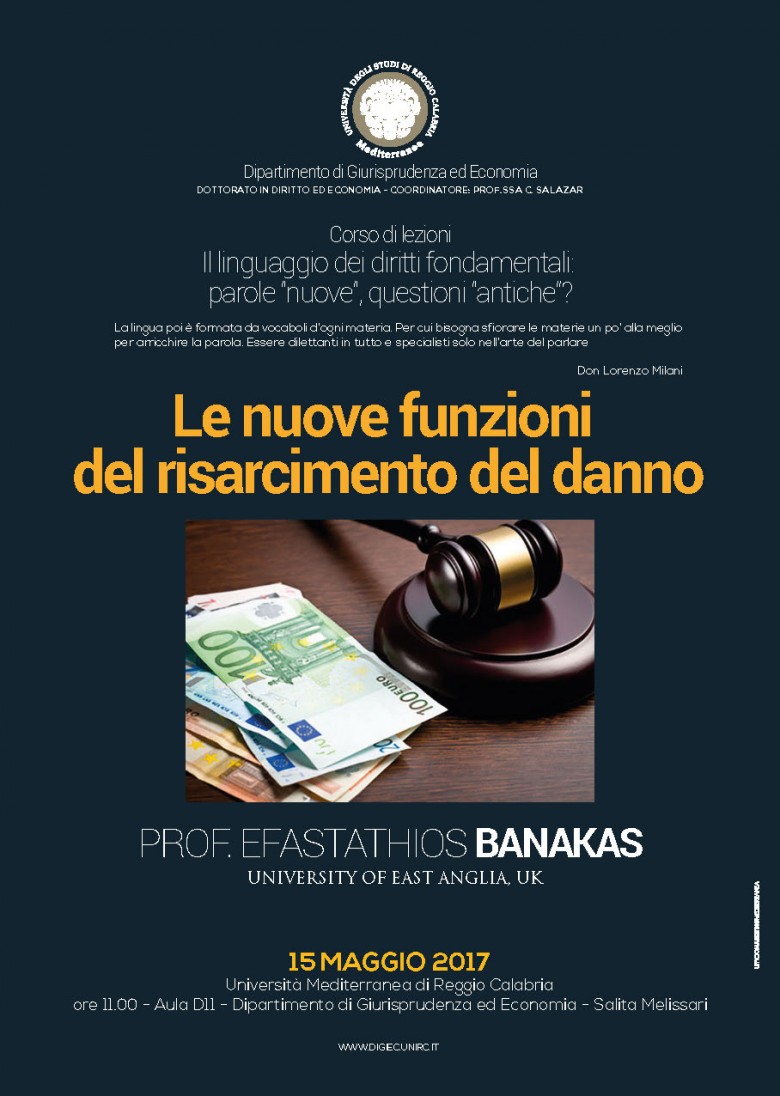 Proseguono le attività del Dottorato in Diritto ed Economia, coordinato dalla prof.ssa C. Salazar. Nel quadro del corso di lezioni su Il linguaggio dei diritti fondamentali. Parole "nuove", questioni "antiche?", il prof. E. Banakas, dell'Università di East Anglia (UK), rifletterà su "Le nuove funzioni del risarcimento del danno".