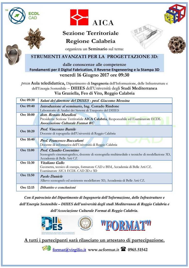 Venerdì 16 giugno 2017 alle ore 9:30, presso Aula teledidattica del Dipartimento di Ingegneria dell’Informazione, delle Infrastrutture e dell’Energia Sostenibile – DIIIES dell’Università degli Studi Mediterranea, si terrà il seminario informativo "Strumenti avanzati per la progettazione 3D: dalle conoscenze alle competenze Fondamenti per il Digital Fabrication, il Reverse Engeneering e la Stampa 3D".