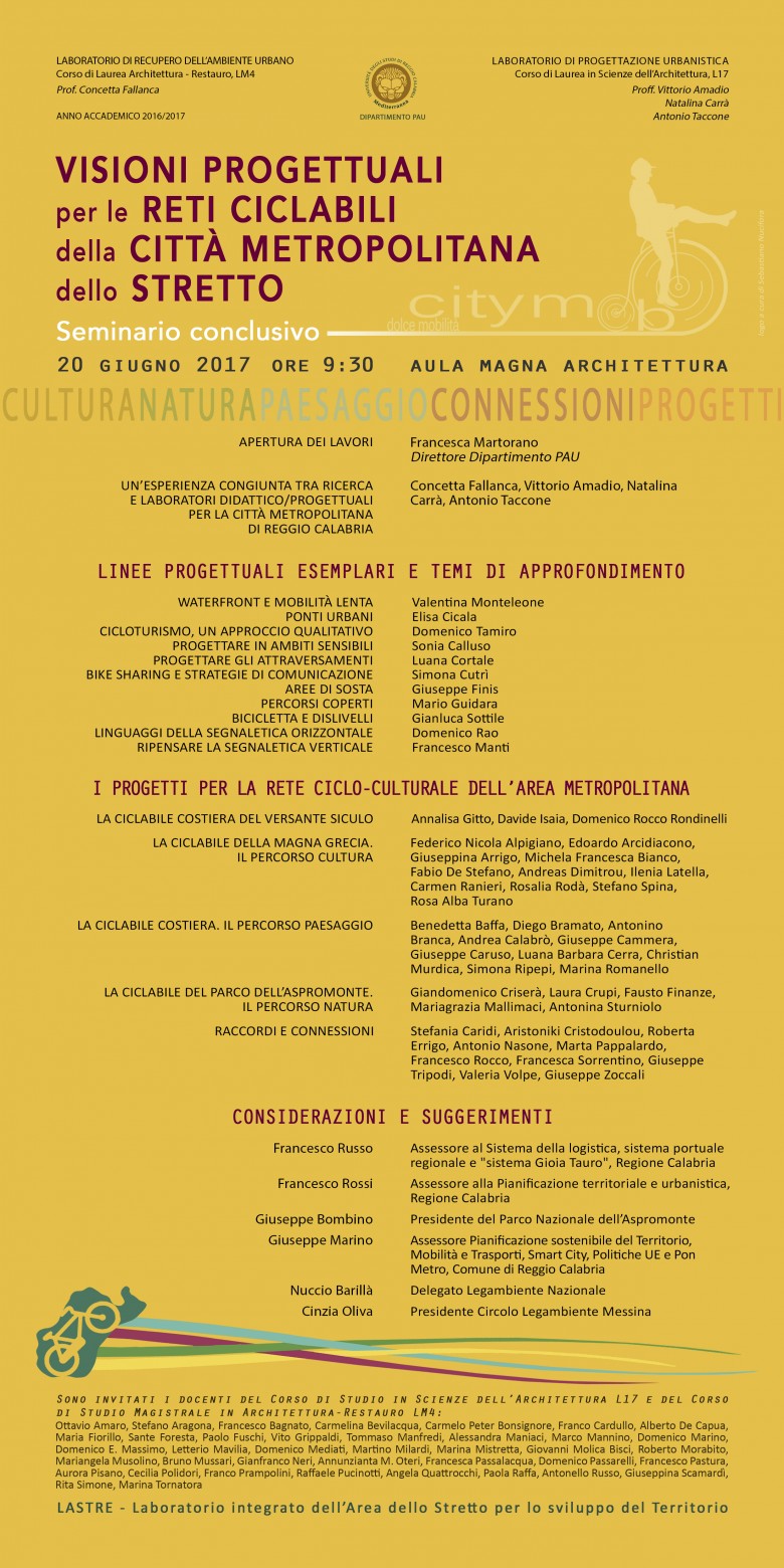 Verranno illustrate dai giovani laureandi della LM4 e della L17 le proposte progettuali elaborate nell’anno accademico 2016-2017 sul tema del cicloturismo culturale per il recupero, la conoscenza e la valorizzazione del patrimonio naturalistico, culturale, sociale e identitario del territorio della città Metropolitana dello Stretto.