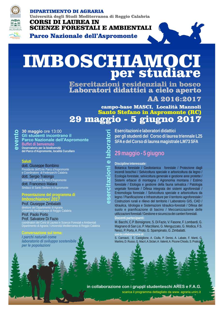 Nella prima settimana di giugno si è conclusa l’edizione 2017 di “Imboschiamoci (per studiare!)”, i tradizionali laboratori a cielo aperto promossi dai Corsi di laurea L25 e LM73 in Scienze forestali e ambientali del Dipartimento di Agraria dell’Università Mediterranea di Reggio Calabria. L’iniziativa, articolata in un ricco programma di esercitazioni didattiche residenziali, dalla fine di maggio ha visto oltre quaranta studenti universitari impegnati a studiare gli ambienti forestali del Parco Nazionale dell’Aspromonte, avendo base operativa nel territorio di Santo Stefano in Aspromonte (RC).
