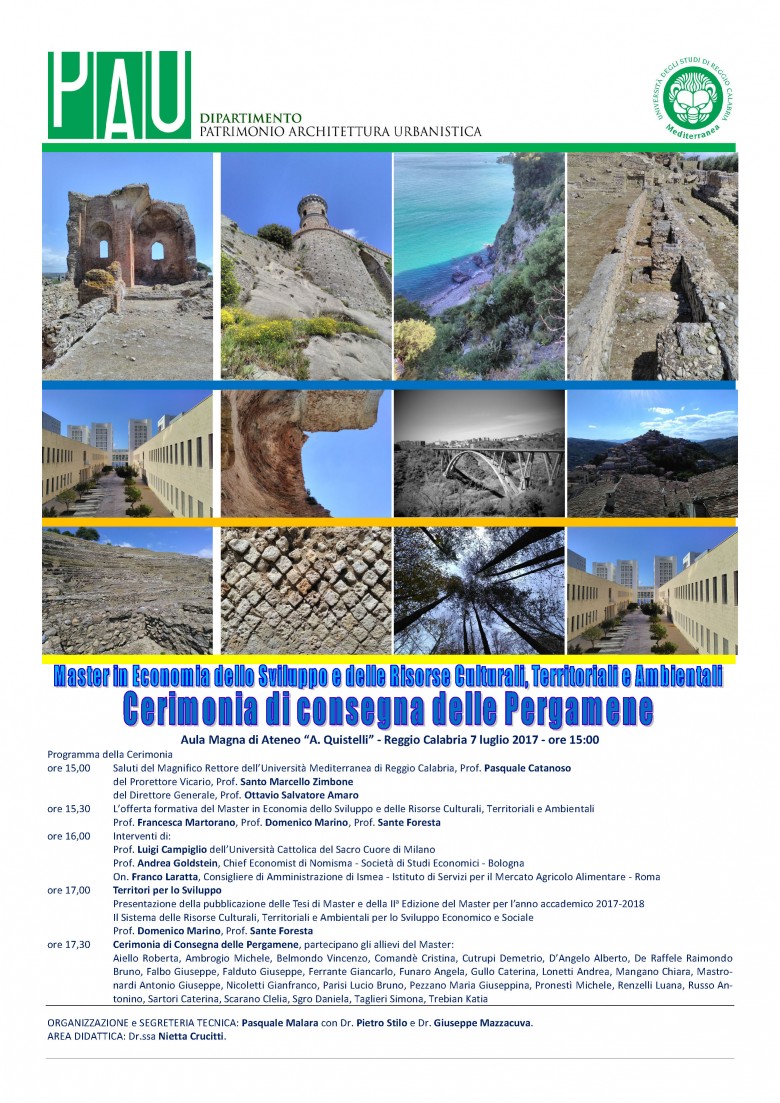 La cerimonia conclusiva del Master di II livello in Economia dello sviluppo e delle risorse culturali, territoriali ed ambientali, dell'Università Mediterranea di Reggio Calabria, tenuto presso il Dipartimento Patrimonio, Architettura, Urbanistica nell’anno accademico 2015-2016 si terrà il 7 luglio alle ore 15.00 presso l’Aula Magna Quistelli.