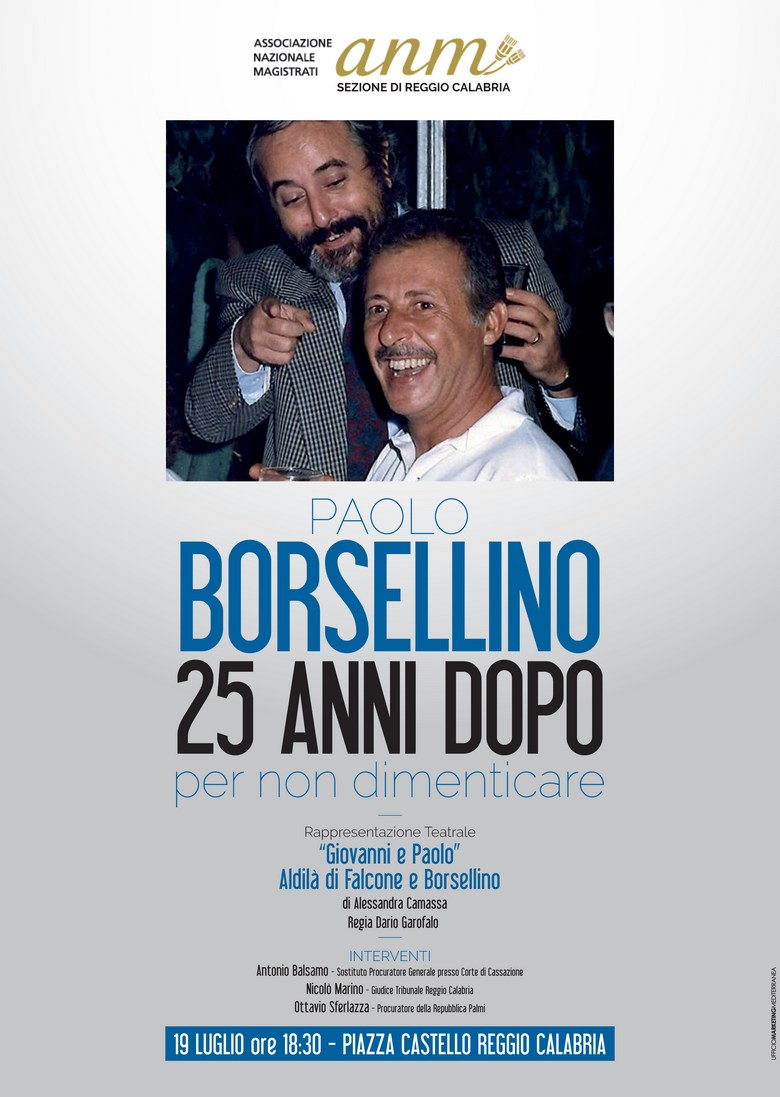Per ricordare la Loro memoria l’Associazione Nazionale Magistrati, sezione di Reggio Calabria, promuove la cerimonia “Paolo Borsellino 25 anni dopo… per non dimenticare” che si svolgerà mercoledì 19 luglio alle ore 18.30 presso Piazza Castello di Reggio Calabria.