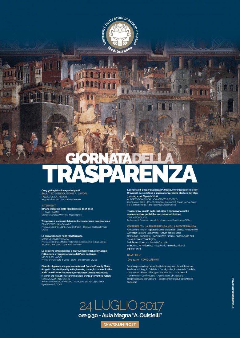 La giornata rappresenta un’opportunità di formazione e di sensibilizzazione sulle problematiche della trasparenza. Nel corso dell’incontro verranno illustrate le attività e i progetti che l’Ateneo sta attuando nel sistema di gestione della trasparenza e dell’anticorruzione, anche in considerazione delle recenti modifiche normative.