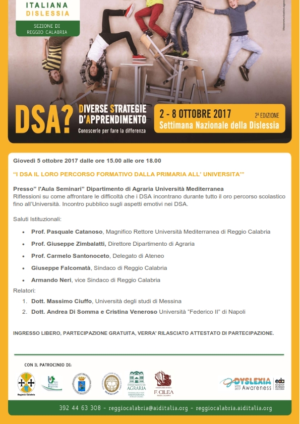 L' Associazione Italiana Dislessia, Sezione di Reggio Calabria organizza un Seminario dal titolo ”I DSA e l’Università’” che si terrà nell’ Aula Seminari Dipartimento di Agraria Università Mediterranea - Feo di Vito - giovedì 5 ottobre 2017 alle ore 15.30.