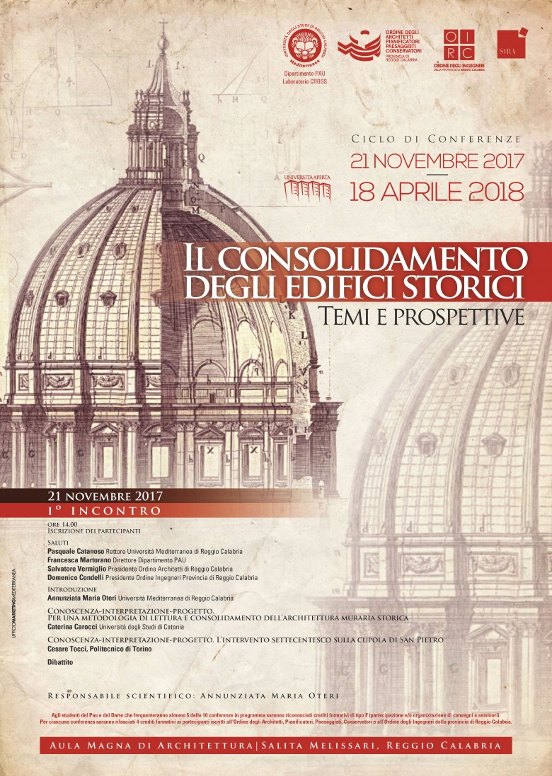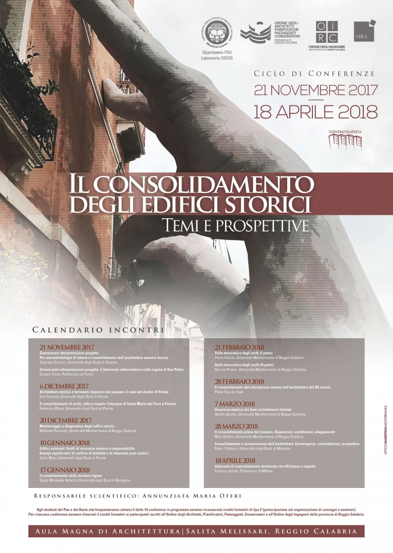 Nata all’interno del corso di consolidamento degli edifici storici del corso di laurea magistrale in Architettura-Restauro del Dipartimento PAU, l’iniziativa, in collaborazione con l’Ordine degli architetti della provincia di Reggio Calabria, intende portare l’attenzione di studenti e professionisti architetti e ingegneri, sul tema complesso del rinforzo strutturale dell’edilizia storica con particolare riferimento alla sicurezza sismica. Il ciclo di conferenze che vede coinvolti docenti universitari con grande esperienza nel settore, si incentrerà sul rapporto, piuttosto controverso, tra sicurezza strutturale e rispetto dei valori autentici degli edifici su cui intervenire e dunque al rapporto fra progetto di consolidamento e progetto di restauro di un dato edificio.
