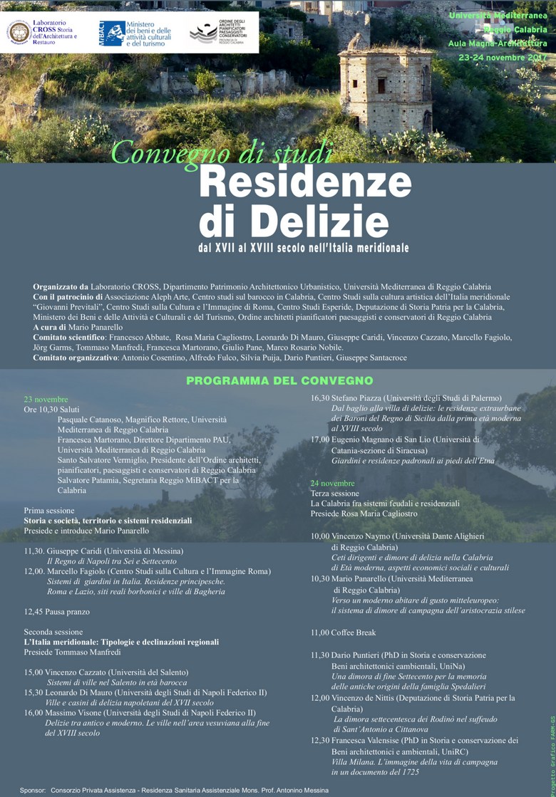 Il convegno, che prende le mosse dalle problematiche connesse agli argomenti emersi in un recente studio condotto su una residenza calabrese, Villa Caristo, mira a chiarire le dinamiche delle genesi dei modelli, della loro diffusione all’interno dei vari contesti culturali e sociali percorsi da un’ideologia comune. Da qui la necessità di meglio chiarire le dinamiche storiche che hanno spinto personaggi specifici a strutturare in modo più articolato il sistema residenziale canonico, quindi di delineare le tensioni culturali che hanno indirizzato verso determinate scelte. In questo contesto appare rilevante, inoltre, mettere a fuoco queste esperienze con quelle dei grandi centri di elaborazione artistica italiana ed europea utili a specificare le declinazioni del tema nelle numerose tipologie sparse sul territorio dell’Italia meridionale.