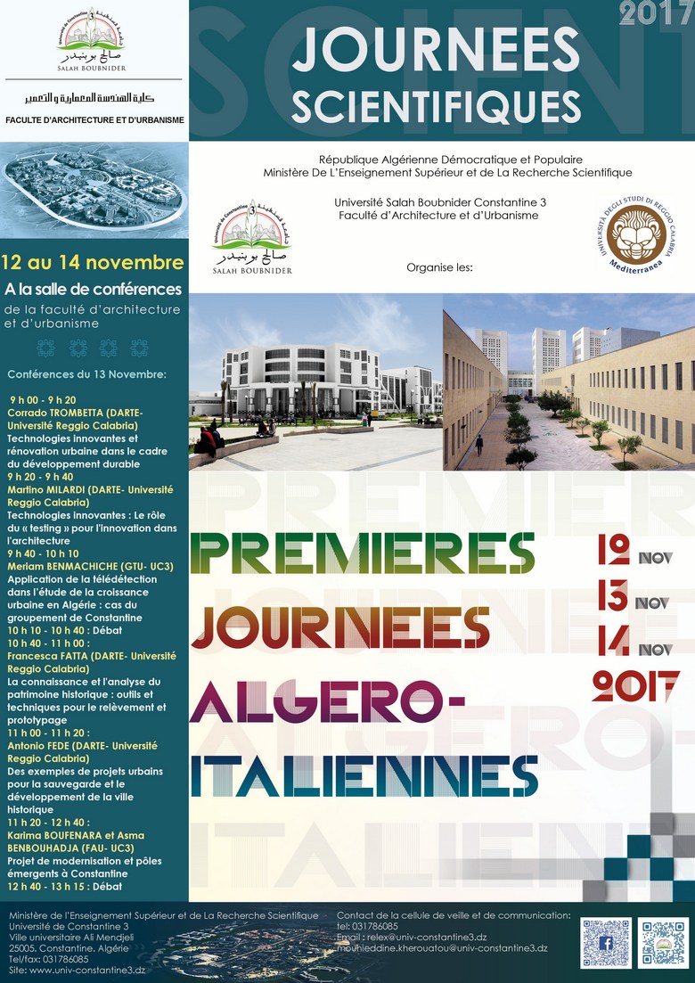 Nell’ambito delle politiche di internazionalizzazione del Dipartimento Architettura e Territorio - dArTe, una delegazione di docenti, composta dai proff. Francesca Fatta, Corrado Trombetta, Martino Milardi e dal dottore di ricerca Antonio Fede, , hanno partecipato su invito alle “Premieres journees algero-italiennes sur la ville durable” Université Salah Boubnider - Constantine 3, Algeria, presentando il BUILDING FUTURE Lab.