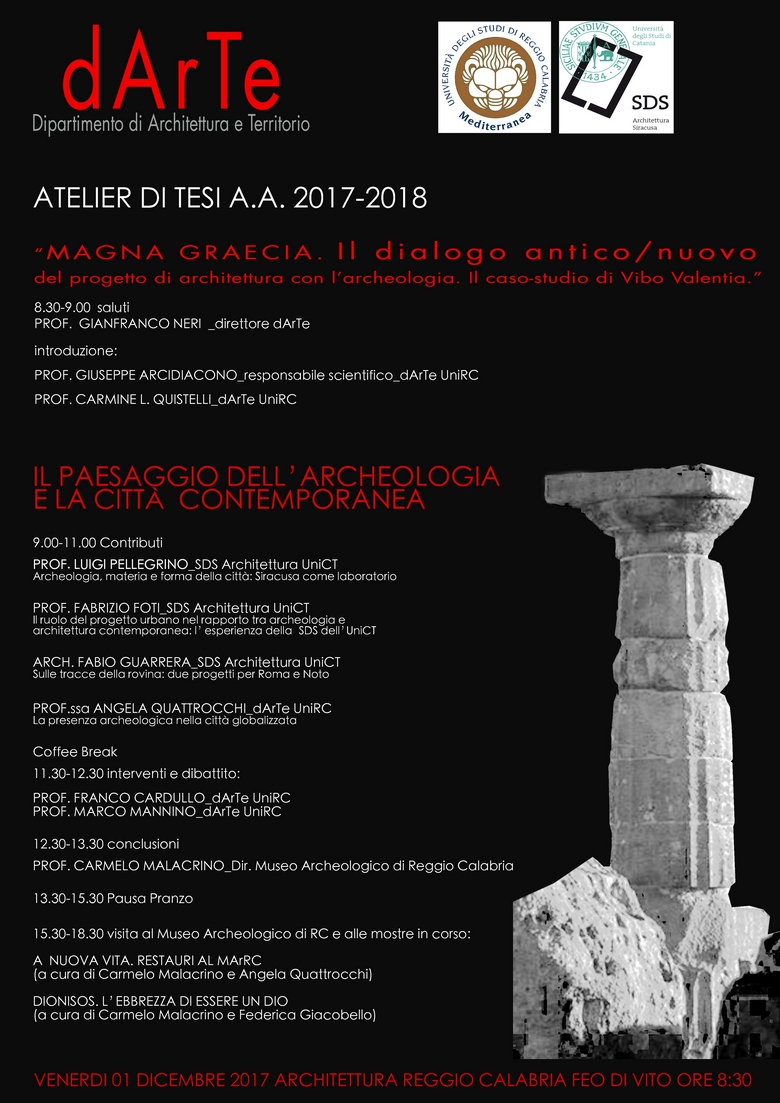 Foti, Pellegrino e Guarrera illustreranno le loro proposte, al contempo scientifiche e creative, sulle complesse relazioni tra modernizzazione urbana e conservazione del patrimonio classico-archeologico, in un confronto con l’Atelier di Tesi UniRC 2017-18 “Magna Graecia: il dialogo Antico-Nuovo” che organizza l’evento e che sotto la direzione del prof. Giuseppe Arcidiacono, responsabile scientifico dell’Atelier, e del prof. Carmine Quistelli, affronta temi analoghi applicati al territorio di Vibo Valentia, con studi e soluzioni di rinnovamento urbano, alla ricerca di una dialettica progettuale fra la tradizione architettonica italiana e l’innovazione contemporanea.