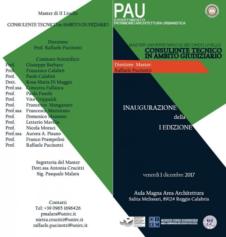 Il 1° dicembre alle ore 10.00, presso l'Aula magna di Architettura, si terrà l'inaugurazione della prima edizione del master di II livello Consulente tecnico in ambito giudiziario.