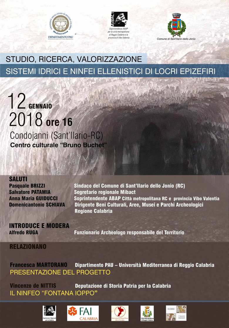 Il prossimo 12 gennaio alle ore 16.00, a Condoianni (Sant’Ilario – RC) presso il Centro culturale “Bruno Buchet” - Vico Uria, verrà presentato il progetto e i primi risultati, tra cui la riscoperta del monumentale ninfeo “Fontana Ioppo”. Su questa importante architettura di età ellenistica, sinora ignota negli studi, relazionerà l’arch. Vincenzo de Nittis.