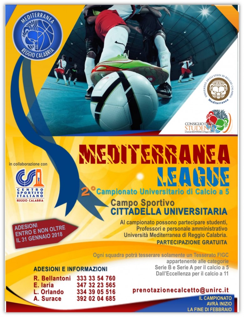 Dopo il successo dello scorso anno, sono aperte le iscrizioni alla seconda edizione del Mediterranea League, il Campionato Universitario di Calcio a 5 dell'Università Mediterranea di Reggio Calabria.
