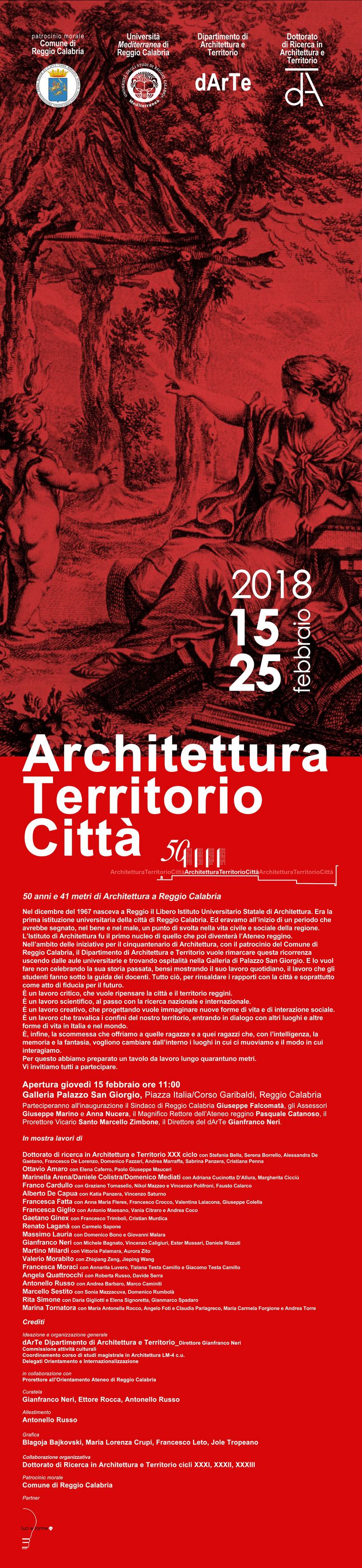 Nell’ambito delle iniziative per il cinquantenario di Architettura, il Dipartimento di Architettura e Territorio (dArTe) vuole rimarcare questa ricorrenza uscendo dalle aule universitarie e trovando ospitalità nella Galleria di Palazzo San Giorgio. E lo vuol fare non celebrando la sua storia passata, bensì mostrando il suo lavoro quotidiano, il lavoro che gli studenti fanno sotto la guida dei docenti. Tutto ciò, per rinsaldare i rapporti con la città e soprattutto come atto di fiducia per il futuro.