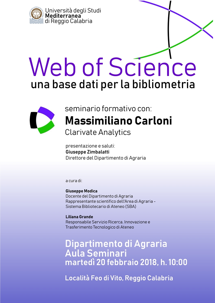 Martedì 20 febbraio alle ore 10.00, presso l'Aula Seminari del Dipartimento Agraria, si terrà un seminario formativo sull'uso della piattaforma WoS (Web of Science), a cura del Dott. Massimiliano Carloni, Strategic Business Manager della Clarivate Analytics, inizio della giornata seminariale con i saluti del direttore del Dipartimento di Agraria Prof. Giuseppe Zimbalatti.