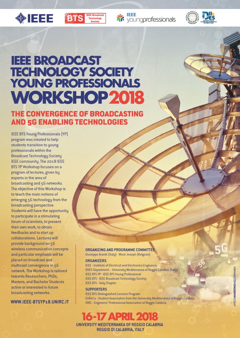 Il 16 e il 17 aprile 2018 avrà luogo, presso l’Università degli Studi Mediterranea di Reggio Calabria, il Workshop internazionale “IEEE Broadcast Technology Society Young Professionals Workshop 2018” dal titolo “The Convergence of Broadcasting and 5G Enabling Technologies”. Tale evento è organizzato dal prof. Giuseppe Araniti, vice-chair del IEEE BTS – Italy Chapter e dal prof. Wout Joseph (Ghent University, Ghent, Belgium), young professionals committee chair.