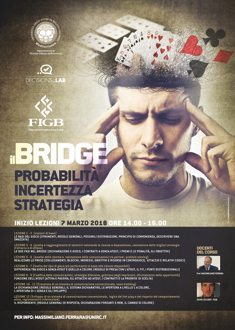 Nell'ambito delle attività didattico-scientifiche del Laboratorio Decision Lab, il 7 marzo alle ore 14, presso la Sala Riunioni Consiglio, sono inizaite inizio le lezioni del Corso "Il bridge: probabilità, incertezza e strategie", tenute dal dott. David Ceccanti (FIGB) e dal prof. Massimiliano Ferrara.
