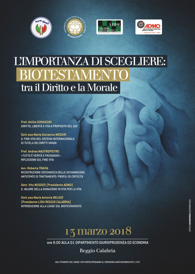 L’Associazione universitaria New Deal, attenta ad offrire nel proprio contesto universitario utili spunti di riflessione ed approfondimento, ha ideato una nuova iniziativa dal titolo: “L’importanza di scegliere: Biotestamento tra il diritto e la morale “, prevista per il giorno 13 marzo dalle ore 9.00, presso il lotto D Aula D1.