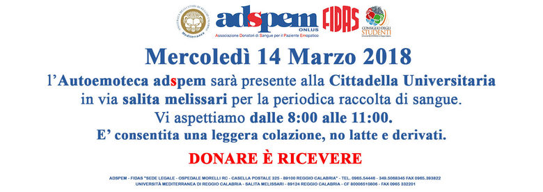 L'Autoemoteca Adspem sarà presente presso la Cittadella universitaria mercoledì 14 marzo dalle ore 8:00 alle ore 11:00.
