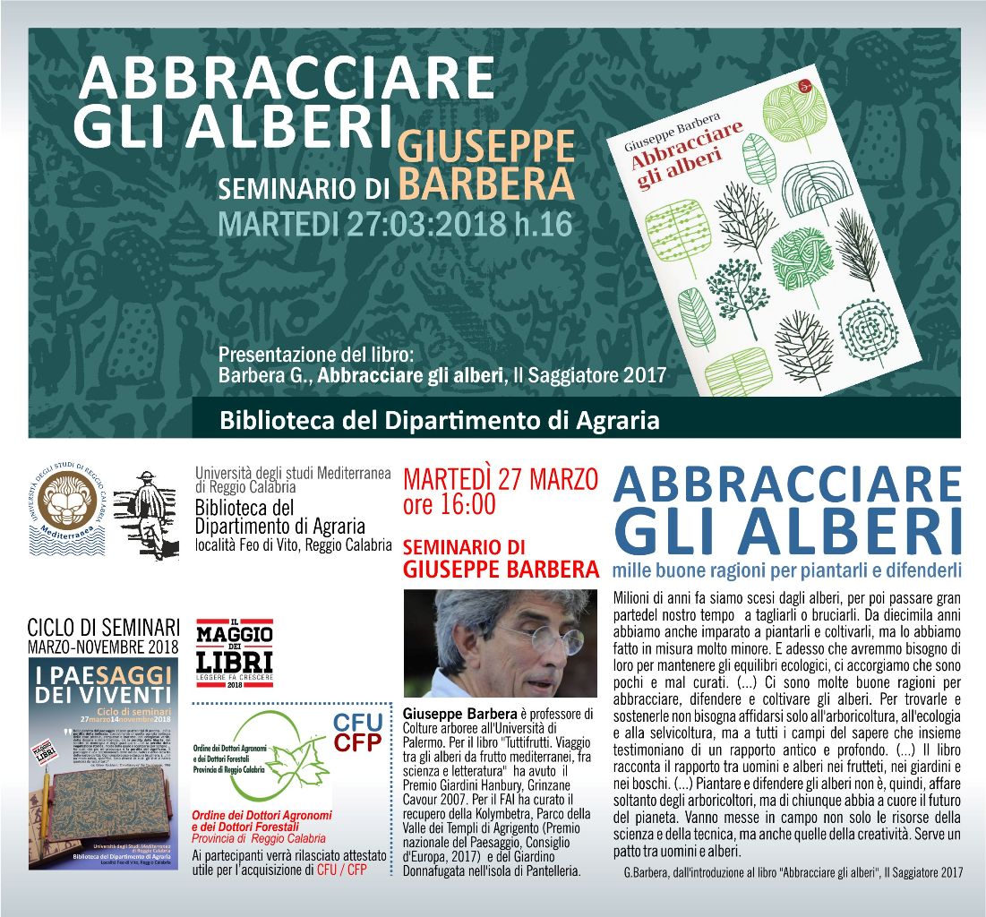 Il primo ospite sarà Giuseppe Barbera, che presenterà la nuova edizione del suo libro “Abbracciare gli alberi” (Il Saggiatore, 2017). Professore di Colture arboree all'Università di Palermo, Barbera è autore di numerosi libri, tra cui "Tuttifrutti. Viaggio tra gli alberi da frutto mediterranei, fra scienza e letteratura" che gli è valso il prestigioso Premio Giardini Hanbury, Grinzane Cavour 2007. Per il FAI (Fondo per l’Ambiente Italiano) ha curato il recupero della Kolymbetra, Parco della Valle dei Templi di Agrigento (Premio Nazionale del Paesaggio 2017, Consiglio d'Europa) e del Giardino Donnafugata nell'isola di Pantelleria.