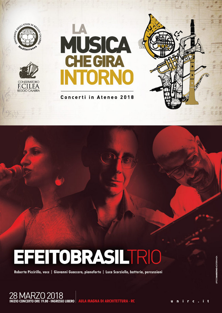 Per "La Musica che gira intorno", mercoledì 28 marzo in Aula Magna Quaroni (Architettura) alle 19.00 l'esibizione di "EfeitoBrasil Trio" composto da Roberta Piccirillo, Giovanni Guaccero e Luca Scorziello.