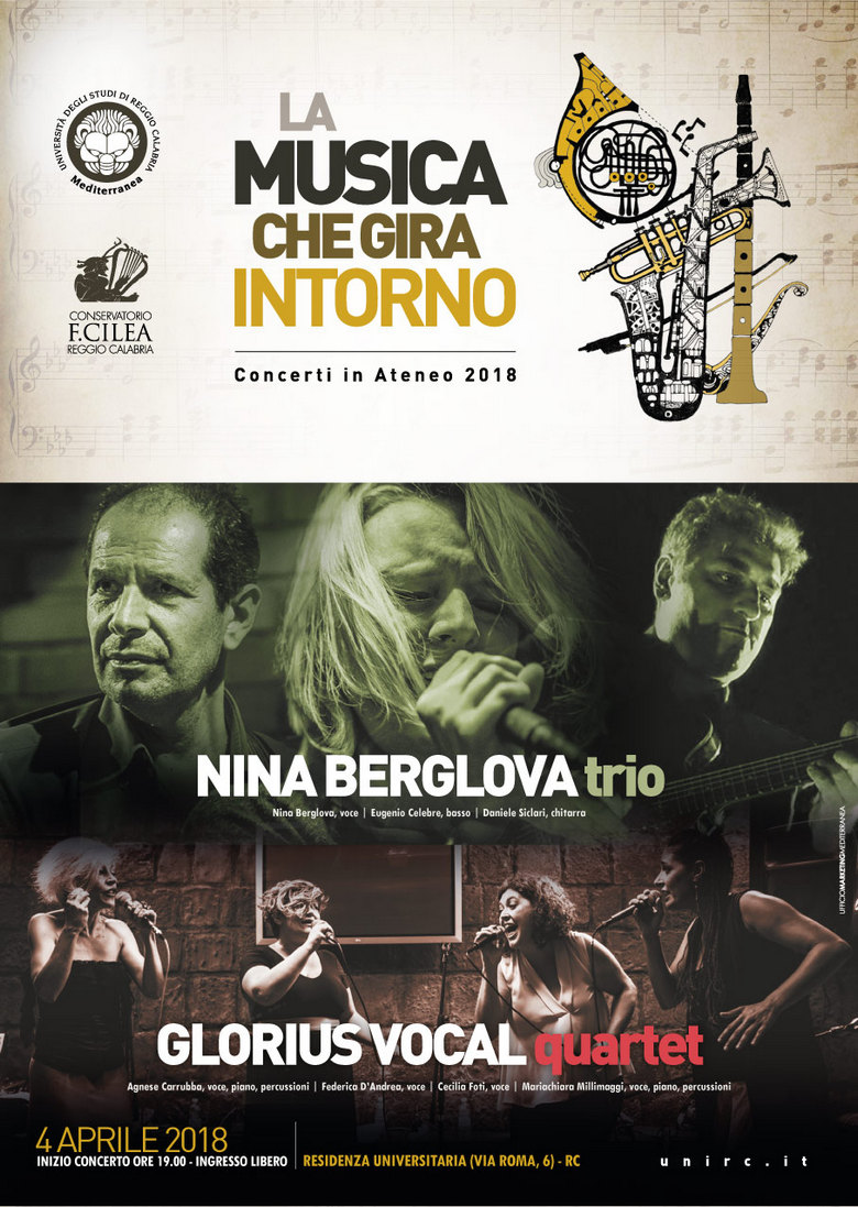Per "La Musica che gira intorno", mercoledì 4 aprile presso la Residenza Universitaria di Via Roma alle 19.00 l'esibizione di Nina Berglova trio e di Glorius Vocal Quartet.