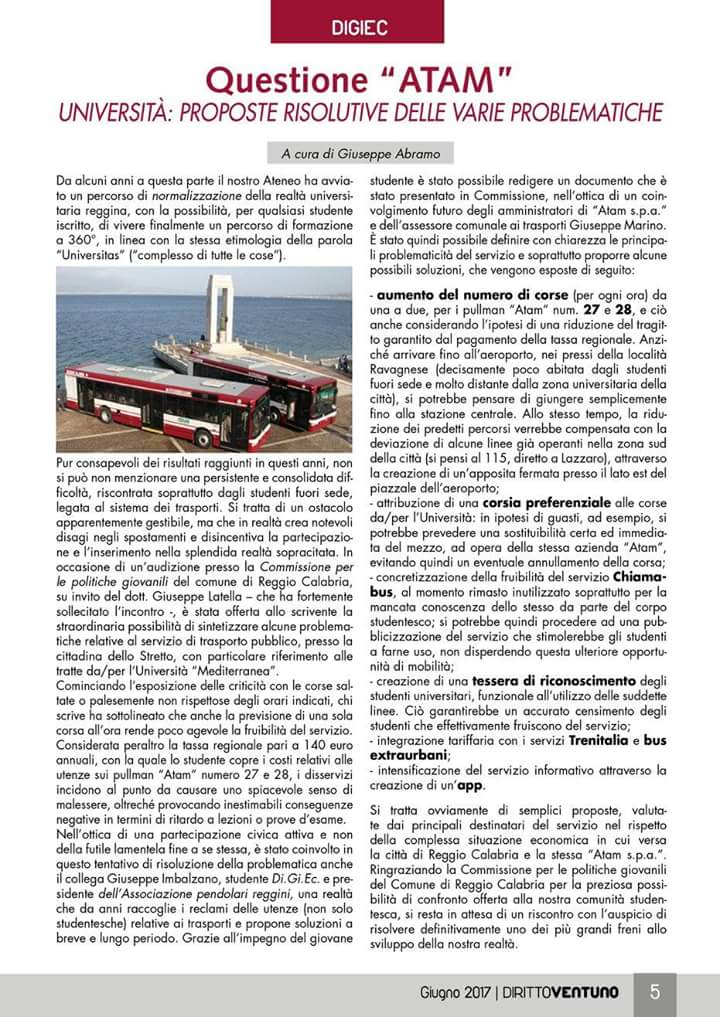 Si tratta della continuazione di un costruttivo percorso, iniziato un anno fa con la Commissione Politiche Giovanili del Comune di Reggio Calabria, che dopo diversi incontri sulla tematica e sulle varie difficoltà incontrate dagli studenti dell’ateneo reggino, ha consentito di avanzare alcune proposte risolutive delle principali problematiche, sintetizzate in un articolo a cura della rivista giuridica Diritto21 dello scorso giugno.