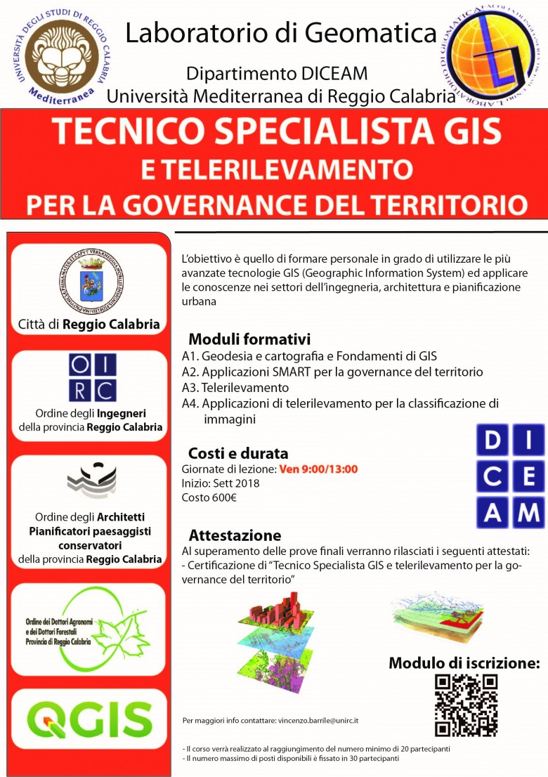 Il Corso si propone di fornire qualificate conoscenze sull’uso delle più moderne metodologie messe a disposizione dalla Geomatica (GIS, WebGIS, modellizzazione dei dati in 3D/4D, rilevamento GPS, Laser Scanner) e di formare nuove figure professionali che, attraverso tali strumenti, siano in grado di analizzare, controllare e gestire realtà geoambientali complesse e di supportare possibili strategie di intervento nei processi di pianificazione e promozione territoriale e dello sviluppo sostenibile della società e delle sue attività (smart mobility e geomarketing).