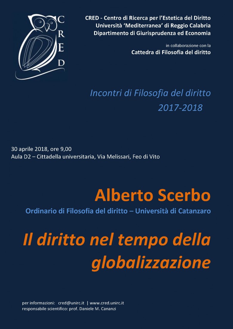 Ad aprire gli Incontri a.a. 2017-2018, lunedì 30 aprile alle ore 9,00 in aula D2, sarà il prof. Alberto Scerbo, ordinario di Filosofia del diritto nell'Università di Catanzaro, che parlerà su Il diritto nel tempo della globalizzazione.