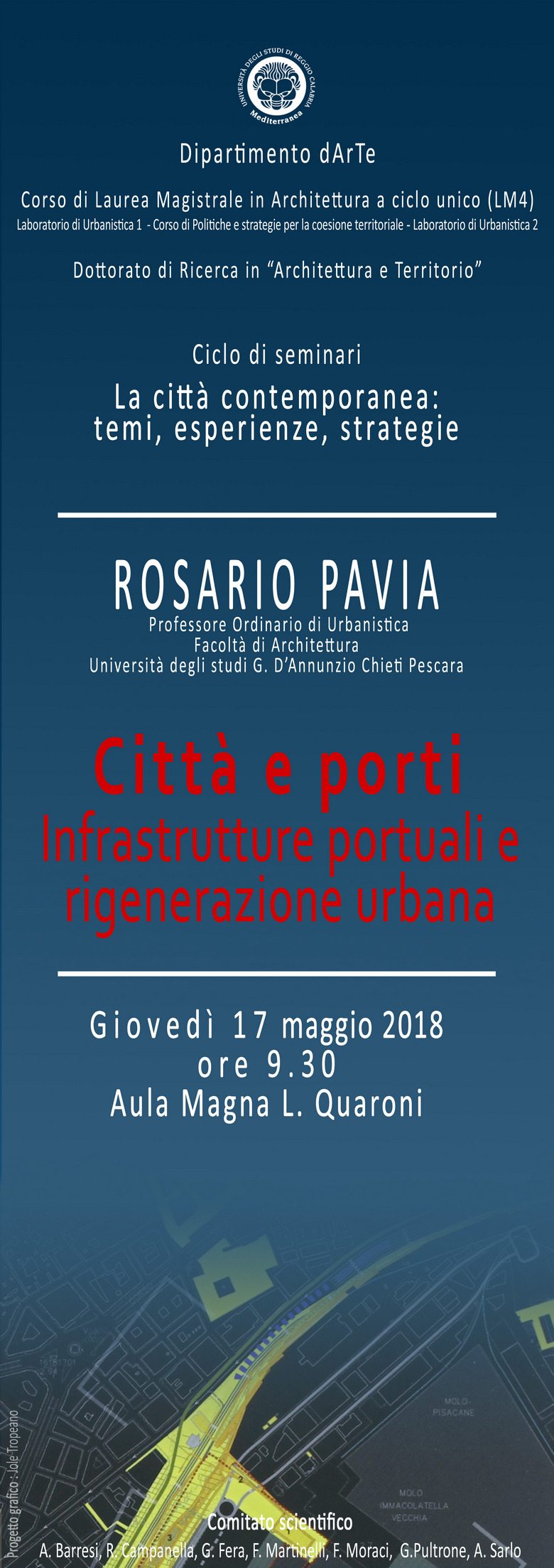 Il 17 maggio 2018 alle ore 9,30 presso l’Aula Magna Ludovico Quaroni, Rosario PAVIA, Professore Ordinario di Teoria dell’Urbanistica presso il Dipartimento di Architettura dell’Università degli Studi di Pescara, terrà il seminario Città e porti. Infrastrutture portuali e rigenerazione urbana”.