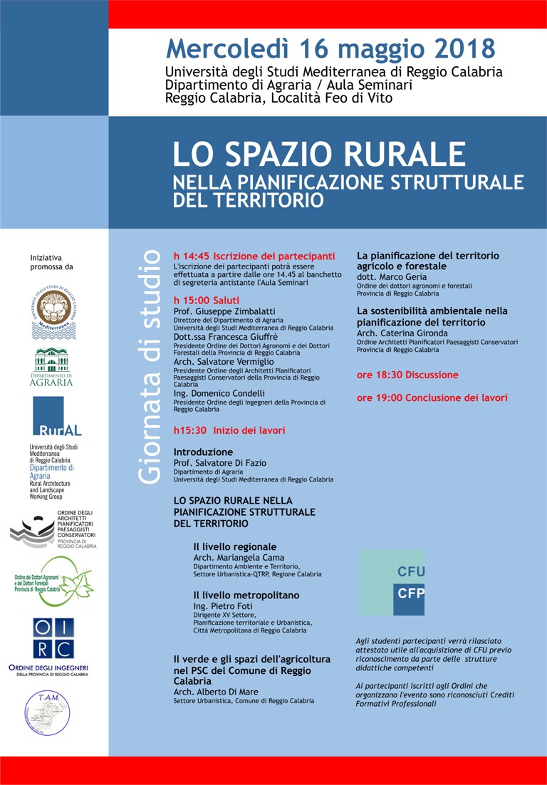 Mercoledì 16 Maggio presso l’Aula Seminari del Dipartimento di Agraria dell’Università Mediterranea di Reggio Calabria (località Feo di Vito) dalle ore 15:00 avrà luogo una Giornata di Studi sul tema “Lo spazio rurale nelle pianificazione strutturale del territorio”. L’iniziativa intende promuovere un confronto a largo spettro sul tema, tra tecnici e professionisti, secondo i diversi livelli di gestione e pianificazione del territorio (regionale, provinciale/metropolitano, comunale), facendo particolare riferimento alla Calabria. La Giornata di Studio è promossa congiuntamente da: Dipartimento di Agraria / RurAL - Rural Architecture and Landscape Working Group dell’Università Mediterranea; Ordine degli Architetti Pianificatori Paesaggisti Conservatori, Ordine dei Dottori Agronomi e dei Dottori Forestali, Ordine degli Ingegneri della Provincia di Reggio Calabria. Ai partecipanti gli Ordini riconoscono Crediti Formativi Professionali. Verrà inoltre rilasciato attestato utile al riconoscimento di CFU da parte delle strutture diidattiche universitarie competenti.