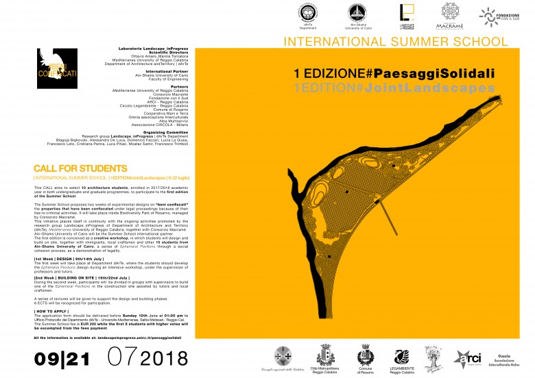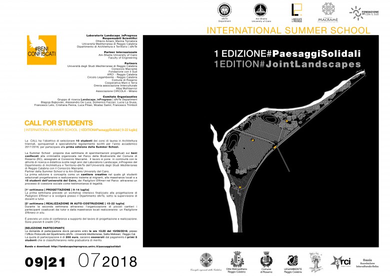 Pubblicato il bando di selezione per la partecipazione all'International Summer School #JointLandscapes sui #BeniConfiscati della durata di 2 settimane, che si terrà dal 9 al 21 luglio 2018 a Reggio Calabria e Rosarno (RC).