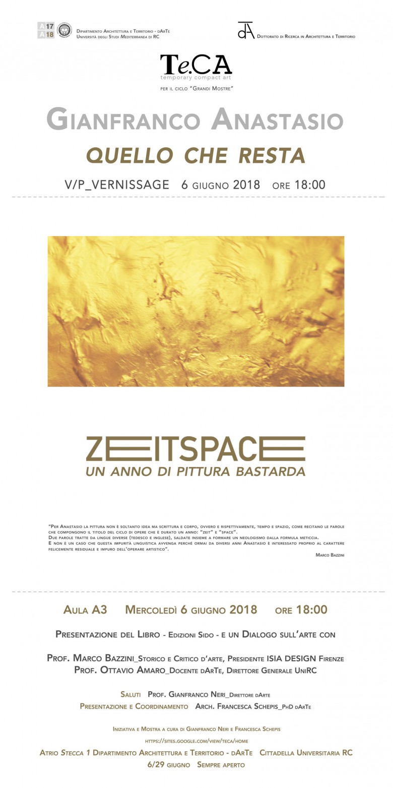 Durante la discussione saranno presentate anche le prime copie del libro ZEITSPACE. Un anno di pittura bastarda – per i tipi di Edizioni Sido – che raccolgono e trasformano in un nuovo manufatto i felici risultati del lavoro di Anastasio.