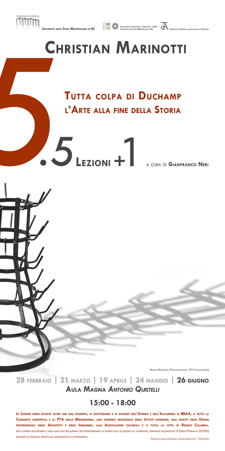 Martedì 26 giugno 2018 dalle ore 15:00 alle ore 18:00 in Aula Magna “Antonio Quistelli” il prof. Christian Marinotti – critico d’arte, docente di Storia dell'arte contemporanea alla Scuola di Architettura, Urbanistica e Ingegneria delle costruzioni del Politecnico di Milano, editore e collezionista – concluderà il Ciclo di 5 Lezioni + 1 (Workshop) con il 5° incontro dal titolo Tutta colpa di Duchamp: l’arte alla fine della Storia.