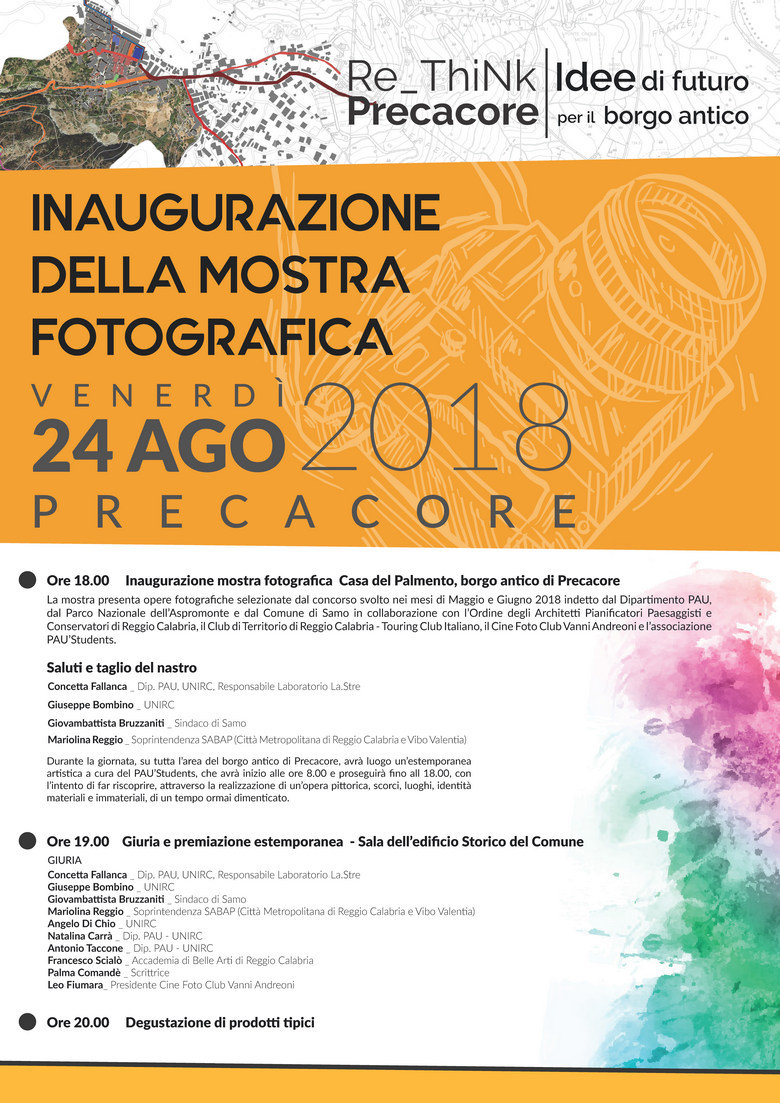 La mostra presenta opere fotografiche selezionate dal concorso svolto nei mesi di Maggio e Giugno 2018 indetto dal Dipartimento PAU, dal Parco Nazionale dell’Aspromonte e dal Comune di Samo in collaborazione con l’Ordine degli Architetti Pianificatori Paesaggisti e Conservatori di Reggio Calabria, il Club di Territorio di Reggio Calabria - Touring Club Italiano, il Cine Foto Club Vanni Andreoni e l’associazione PAU’Students.