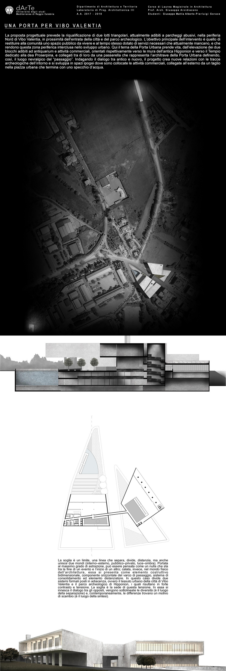 Giuseppe Mattia Alberto e Pierluigi Gerace hanno vinto il Premio della Critica con il progetto "Una porta per Vibo Valentia", elaborato nel Corso di laurea magistrale in Architettura dell'Università Mediterranea diretto dal prof. Giuseppe Arcidiacono con la seguente motivazione: