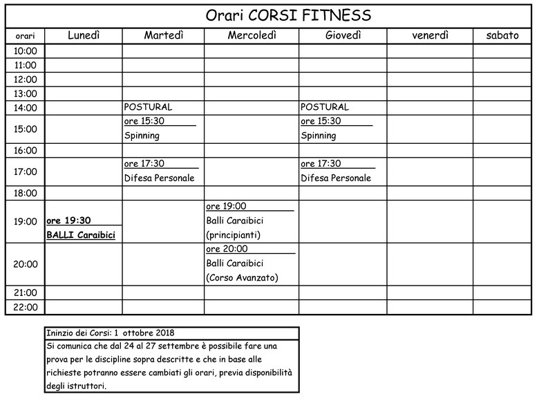 I corsi in programmazione oltre i Balli Caraibici, Spinning, Postural, Difesa Personale e Yoga della Risata. Si comunica inoltre, che in base alle richieste che perverranno potranno essere cambiati gli orari e i giorni, previa disponibilità degli istruttori.