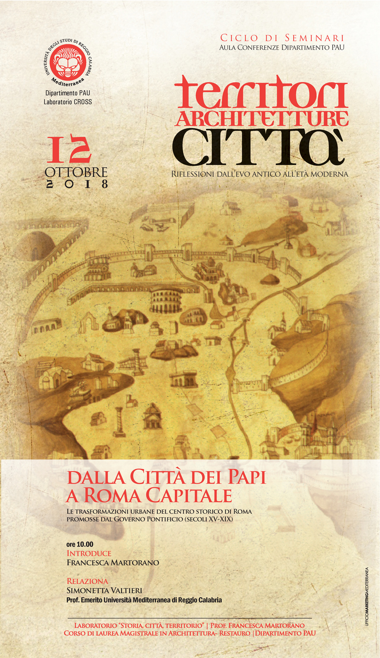 Il programma dei seminari del Laboratorio di “Storia, città, territorio” del corso di laurea magistrale in Architettura-Restauro del Dipartimento PAU, docente la professoressa Francesca Martorano, inizia il prossimo 12 ottobre alle ore 10.00. I seminari si svolgeranno nei mesi di ottobre, novembre e dicembre 2018.