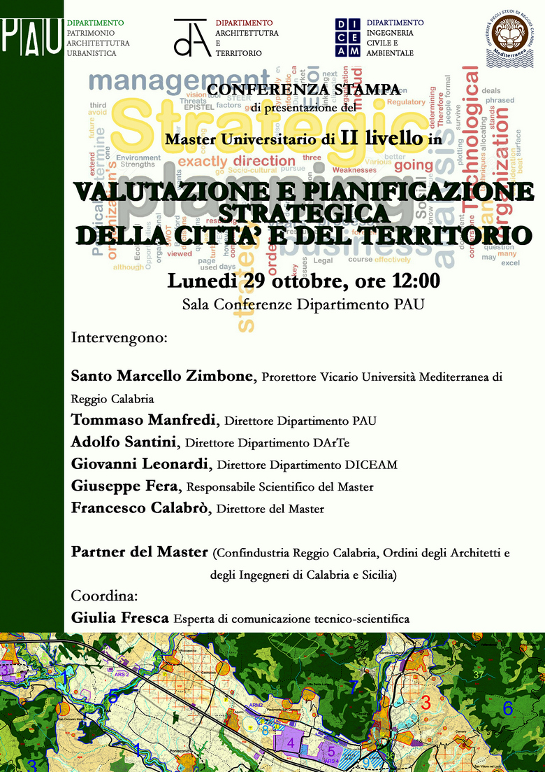 Lunedì 29 ottobre alle 12.00 presso la Sala conferenze del Dipartimento PAU, si svolgerà la conferenza stampa di presentazione del Master in Valutazione e pianificazione strategica della città.
