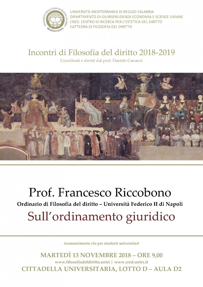 Martedì 13 novembre alle ore 9.00 presso l'aula D2, il prof. Francesco Riccobono, ordinario di Filosofia del diritto nell'Università Federico II di Napoli, terrà la lezione dal titolo: Sull'ordinamento giuridico.