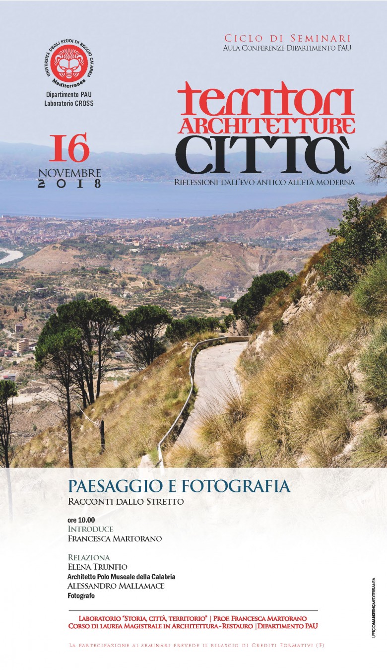 Dalla convinzione che la narrazione del paesaggio debba necessariamente essere un dialogo a più voci e dall’esigenza di testimoniare le modificazioni del territorio dello Stretto di Messina, nel 2013 nasce “Racconti dallo Stretto”. Curato dal fotografo Filippo Romano e dall’associazione Il cerchio dell’immagine, di cui fanno parte i relatori, il progetto, attraverso il linguaggio del ritratto ambientale e della fotografia di paesaggio, si propone di creare un archivio visuale, in costante aggiornamento, basato sulla ricerca dell’identità storica e contemporanea delle due sponde dello Stretto. La finalità è quella di costituire una base documentale che possa supportare successivi studi e percorsi di conoscenza sul territorio di riferimento.