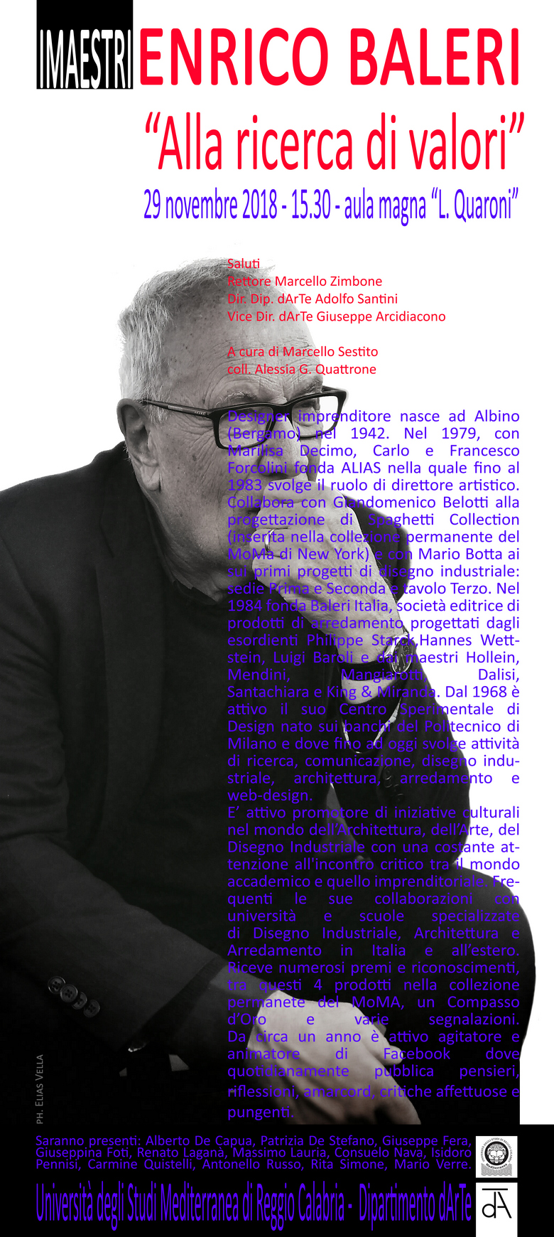 Il primo incontro, 29 novembre 2018 ore 15,30, aula magna Ludovico Quaroni, avrà come ospite il designer Enrico Baleri che parlerà di nuovi valori, all’incontro, aperto a tutti gli studenti, vi parteciperanno numerosi professori della Mediterranea.