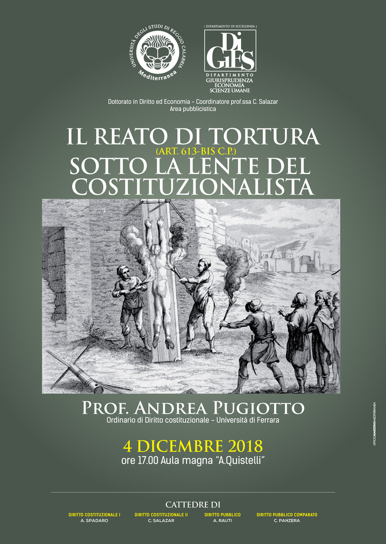Il 4 dicembre, alle ore 17.00, il prof. Andrea Pugiotto (Ordinario di Diritto costituzionale, Università di Ferrara) ha tenuto in Aula magna Quistelli una conferenza sul tema “Il reato di tortura (art. 613-bis c.p.).Profili costituzionali”.