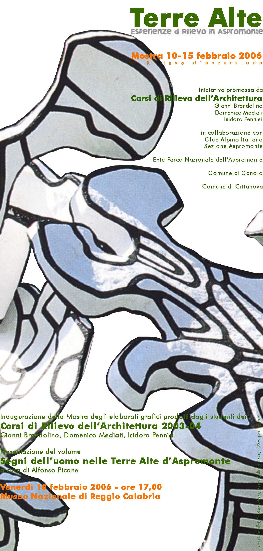 Venerdì 10 febbraio 2006 alle 17.00 presso il Museo Nazionale di Reggio Calabria si inaugura Terre Alte, la mostra degli elaborati dei Corsi di rilievo dell'Architettura 2003/04. Nella stessa occasione viene presentato il volume Segni dell'uomo nelle Terre alte d'Aspromonte, di Alfonso Picone. La mostra rimane aperta fino al 15 febbraio. In allegato la locandina.