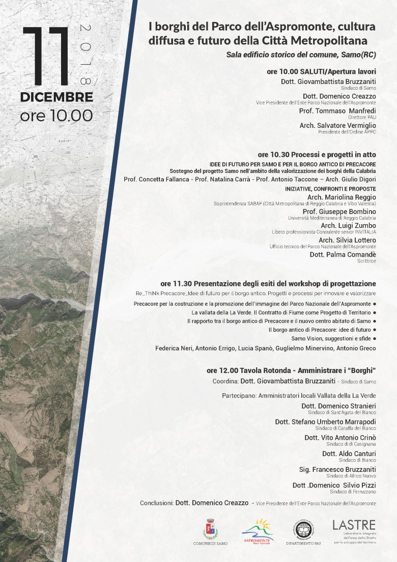 L’incontro sarà una utile occasione, oltre che per discutere del modo corretto di immaginare il futuro dei borghi, alla luce del simposio “Un paese ci vuole” tenuto dal 7 al 9 novembre 2018, anche per presentare gli esiti del primo anno di attività della convenzione tra il Dipartimento PAU e il Comune di Samo in attuazione all’accordo di programma quadro siglato con l’Ente Parco Nazionale dell’Aspromonte.