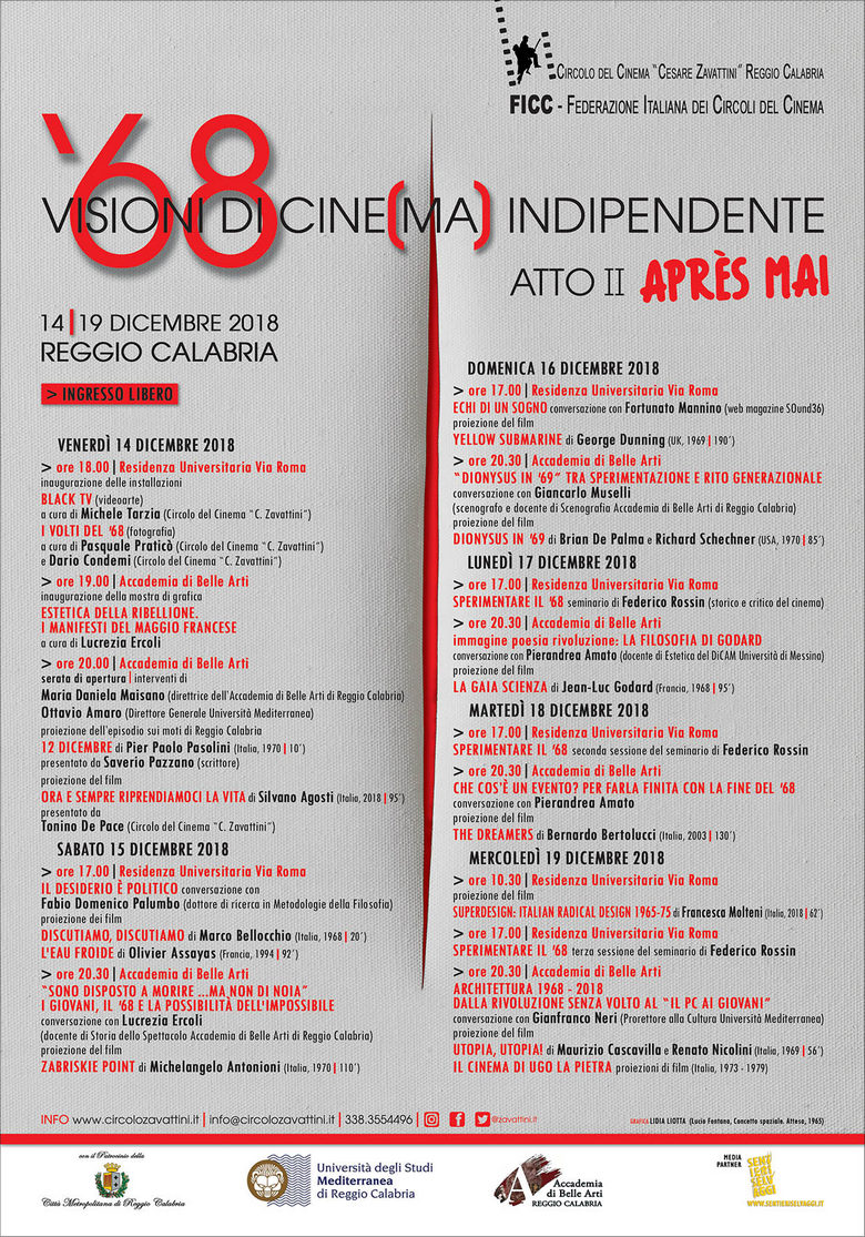 Le proiezioni e gli incontri pomeridiani si terranno presso la Residenza Universitaria di Via Roma, mentre quelli serali presso l'Accademia di Belle Arti di Reggio Calabria, che ospiterà la mostra di manifesti del '68.