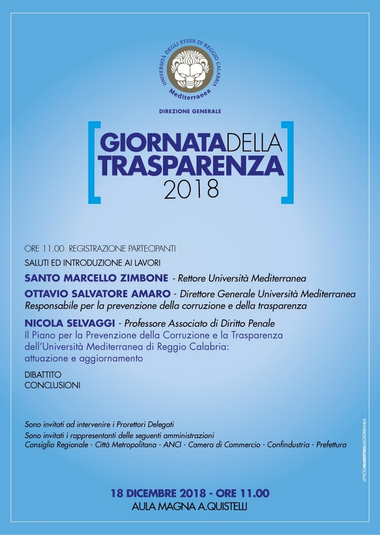 Il concetto di trasparenza trova il suo apice nella Giornata della Trasparenza, espressamente prevista dalla normative in materia di trasparenza e fortemente sostenuta dal’Autorità Nazionale Anticorruzione. Rappresenta un importante momento di confronto sul livello di trasparenza, di legalità e di sviluppo della cultura dell’integrità nelle pubbliche amministrazioni, un’ occasione importante per rendere partecipe tutta la comunità universitaria e i portatori di interesse, degli obiettivi strategici che l’Ateneo, anche in collaborazione con i partner del contesto territoriale di riferimento, si sta impegnando a perseguire con una costante attenzione al miglioramento della qualità dei servizi offerti. Inoltre, sarà l’occasione per condividere le novità e lo stato di attuazione della normativa in materia di anticorruzione e trasparenza all’interno dell’Ateneo.